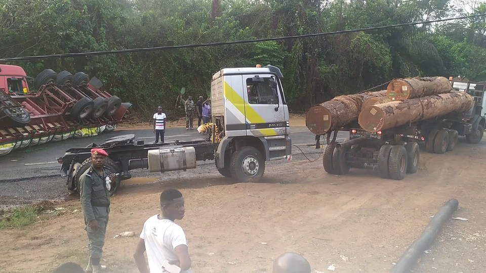 Un camion semi-remorque transportant 40 tonnes de riz s’est retrouvé, les quatre fers en l’air, en travers de la chaussée au lieu-dit carrefour Nkankanzock, à 5 km d’Edéa ce samedi 20 février 2021.