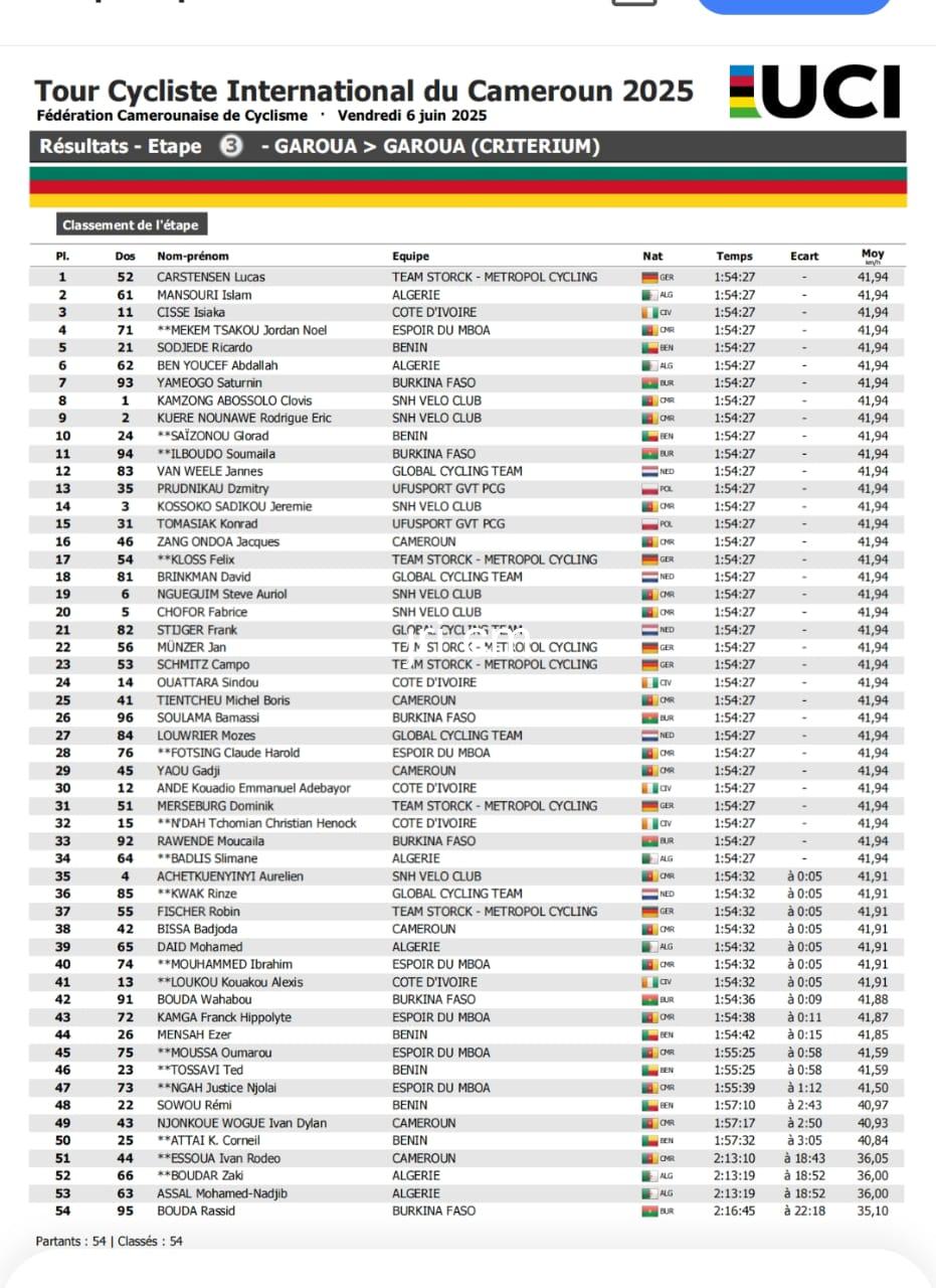 Pour ajouter plus de joie à cette célébration de l’octogénaire, Lucas Carstensen a mis tout le peloton d’accord à la deuxième et la troisième étapes, sur des sprints courts aux arrivées. Le coureur Allemand va d’ailleurs, lui aussi, fêter ses 31 ans le 16 juin 2025, au lendemain de la dernière étape du Tour du Cameroun. Le sprinter n’en n’est pas à ses premiers succès en Afrique, lui qui a gagné trois étapes du Tour du Sénégal en 2017, une étape du Tour de Tunisie la même année, et la première étape de la défunte Tropicale Amissa Bongo en 2018. C’est donc un professionnel, spécialiste des finales d’étapes au sprint qui a gagné à Figuil lors des 110 km de la deuxième étape en ligne, et à Garoua dans les 80 km de Critérium.